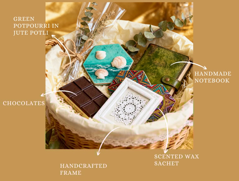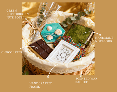 Elegant hamper featuring luxe artisan crafts, snacks, stationery, and keepsakes.